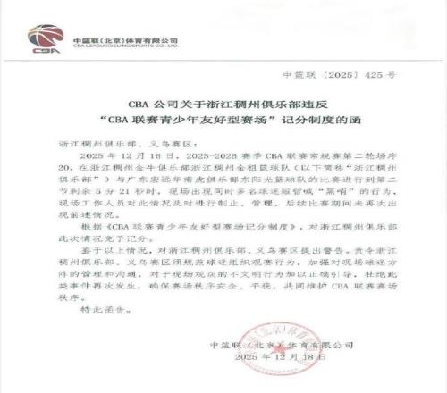 CBA公司关于浙江稠州俱乐部违反“CBA联赛青少年友好型赛场”记分制度的函